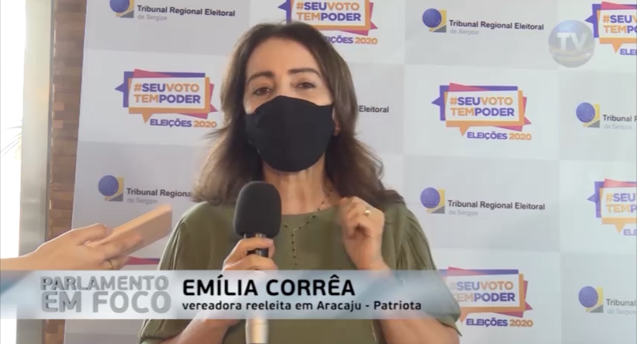 #PraTodoMundoVer: Vídeo da vereadora Emília Corrêa durante a solenidade de posse concedendo entrevista ao Parlamento em Foco. Emília, que está de cabelo solto, usando máscara, e um vestido verde, segura o microfone gesticulando enquanto fala.